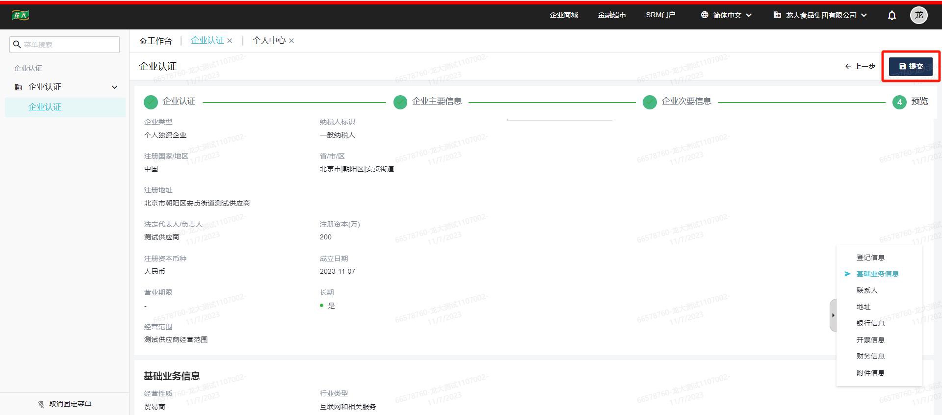 4、企業(yè)驗(yàn)證通過后,依次填寫企業(yè)主要信息、企業(yè)次要信息、預(yù)覽檢查無誤后,點(diǎn)擊右上角提交認(rèn)證審核。注冊認(rèn)證過程中如遇問題,可聯(lián)系甄云客服:400-116-0808解決,或與業(yè)務(wù)對(duì)接人聯(lián)系。